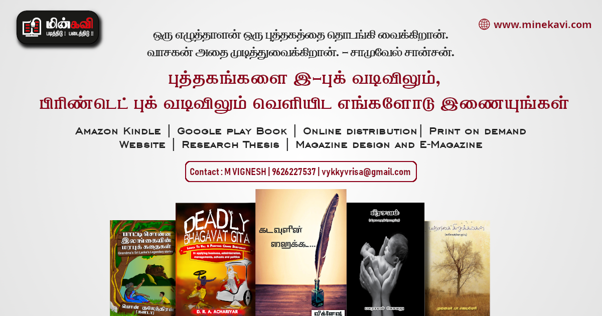 MIN E KAVI is the First fully network-based Publication. We provide books-related services like ebooks, printed books, typing, spellcheck, online distribution, design services, E-Magazines etc. On the other hand, we also offer IT services like Web development, e-commerce web design, and App development.