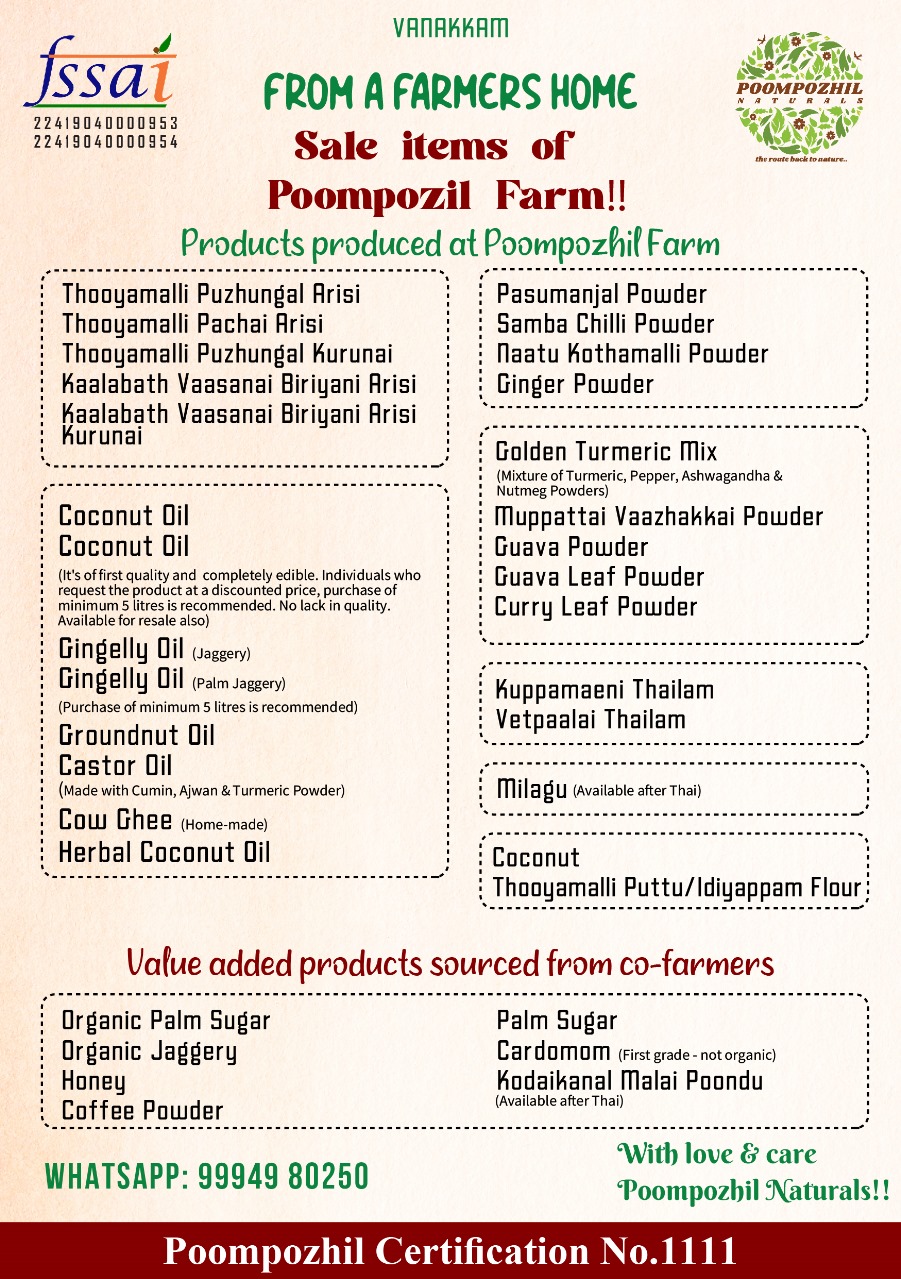 Natural farmer from dindigul district. Selling farm produces and value additions to consumers directly. Speciality is traditional(thooyamalli) rice, organic raw turmeric powder( curcumin level is 4.75%),